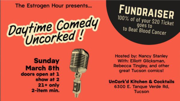 Join us for Daytime Comedy Uncorked! — a high-energy afternoon of laughter, hosted by the fabulous Nancy Stanley and featuring Elliott Glicksman, Rebecca Tingley, and other great Tucson comics.